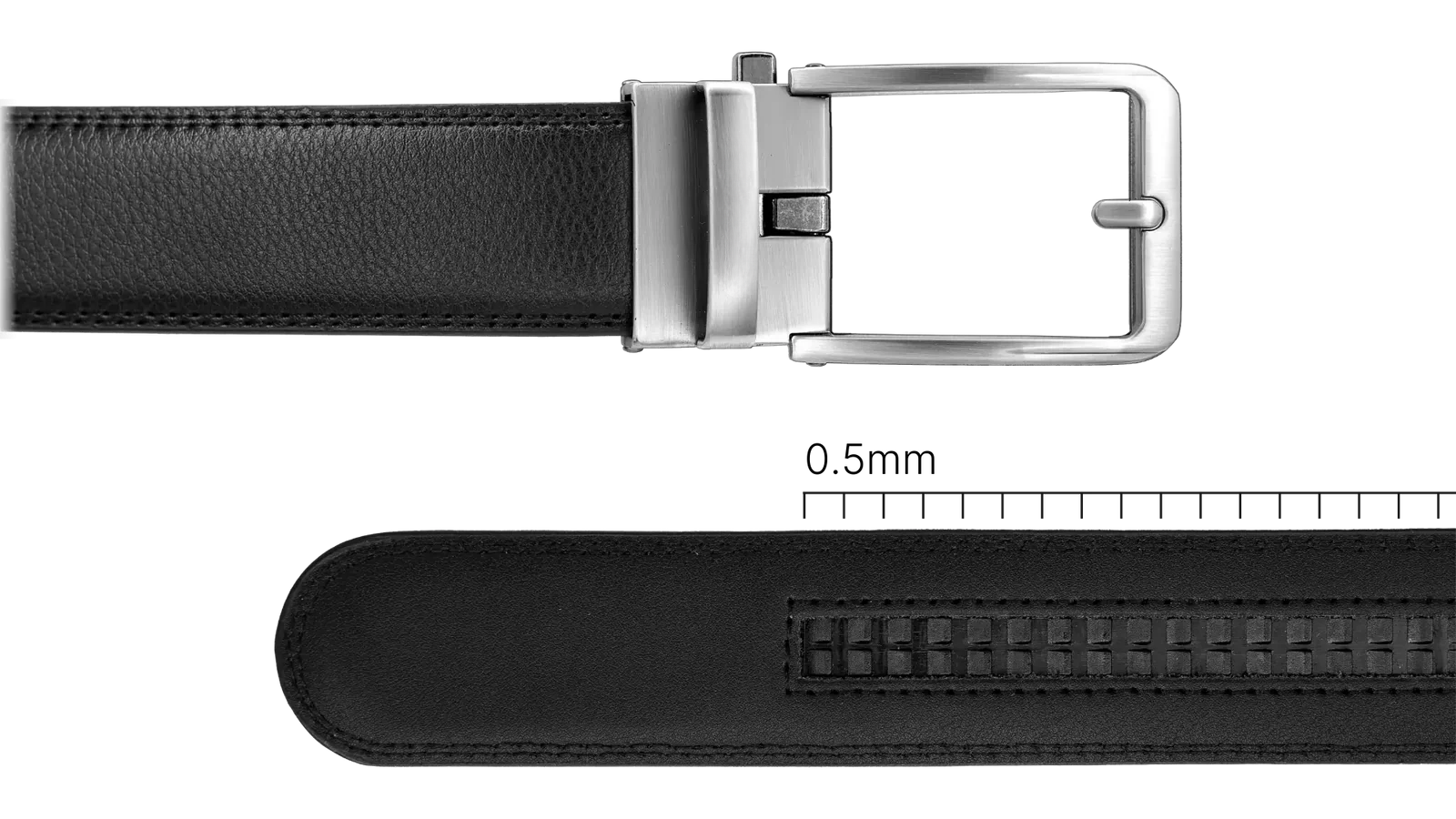 Doblar el cinturón para meter la hebilla en un agujero lo destruye. Por eso, el nuestro funciona de forma muy simple: insertar y ajustar. Así, el cuero nunca se dobla y se mantiene perfecto.
